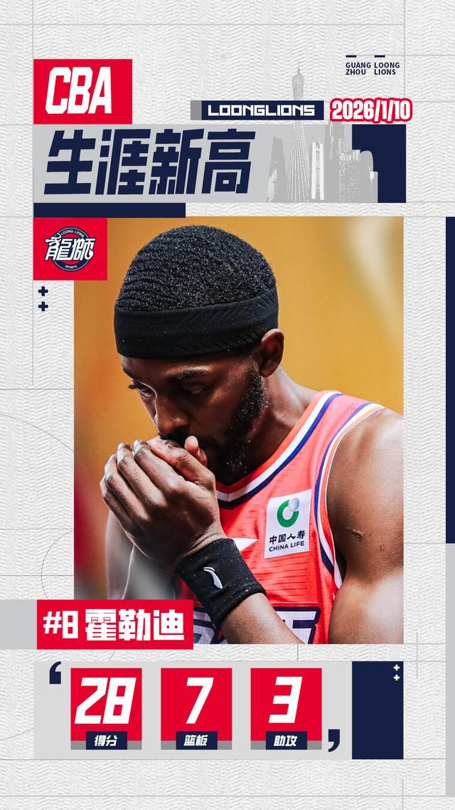 龙狮篮球俱乐部2026-01-10 22:34:532025-26赛季CBA常规赛第十三轮四连主第三场大胜四川广州朗肽海本 106 : 76战胜四川丰谷酒业数据方面:霍勒迪28分7篮板3助攻拿下CBA生涯新