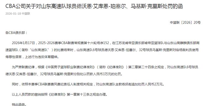 2026年1月17日,2025-2026赛季CBA联赛常规赛第十六轮场序152,在江苏龙肯帝亚俱乐部肯帝亚篮球队与山东山高麒麟俱乐部高速篮球队(简称“山东高速队”)的比赛结束时,山东高速队6号球员德沃恩·艾库恩-珀塞尔、32号球员马基斯·克里斯对临场裁判员使用侮辱性语言,上述行为违反体育精神。