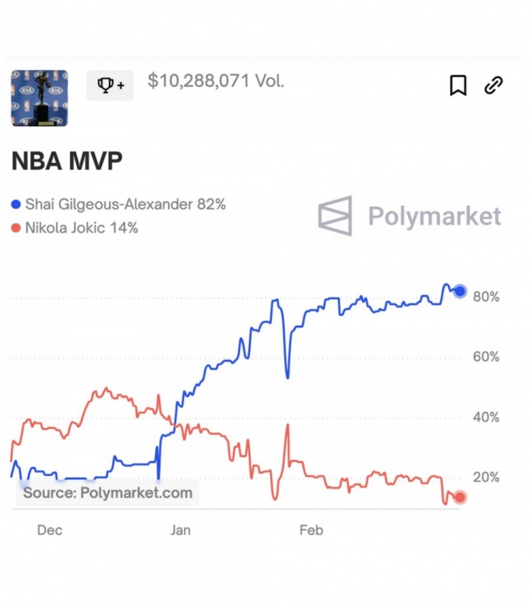 赛后美媒Polymarket更新了MVP概率,约基奇仅有14%,而亚历山大则高达82%。