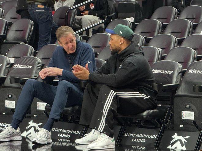 赛前,ESPN记者Anthony Slater在社交媒体分享照片,利拉德和前开拓者主教练(现勇士助教)斯托茨在场边叙旧。