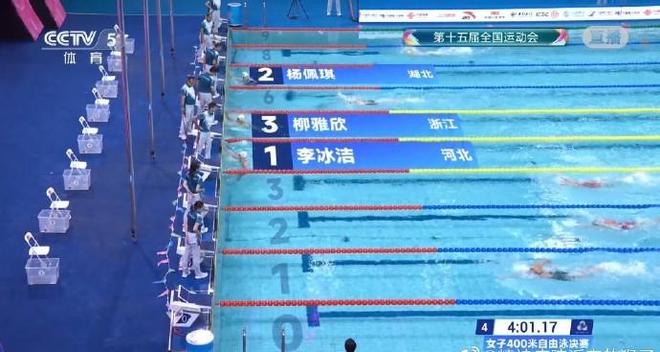 11月10日,全运会游泳女子400米自由泳:河北选手李冰洁夺得金牌,成绩为4:01.17,杨佩琪4:01.90收获银牌,柳雅欣4:03.20获得铜牌。