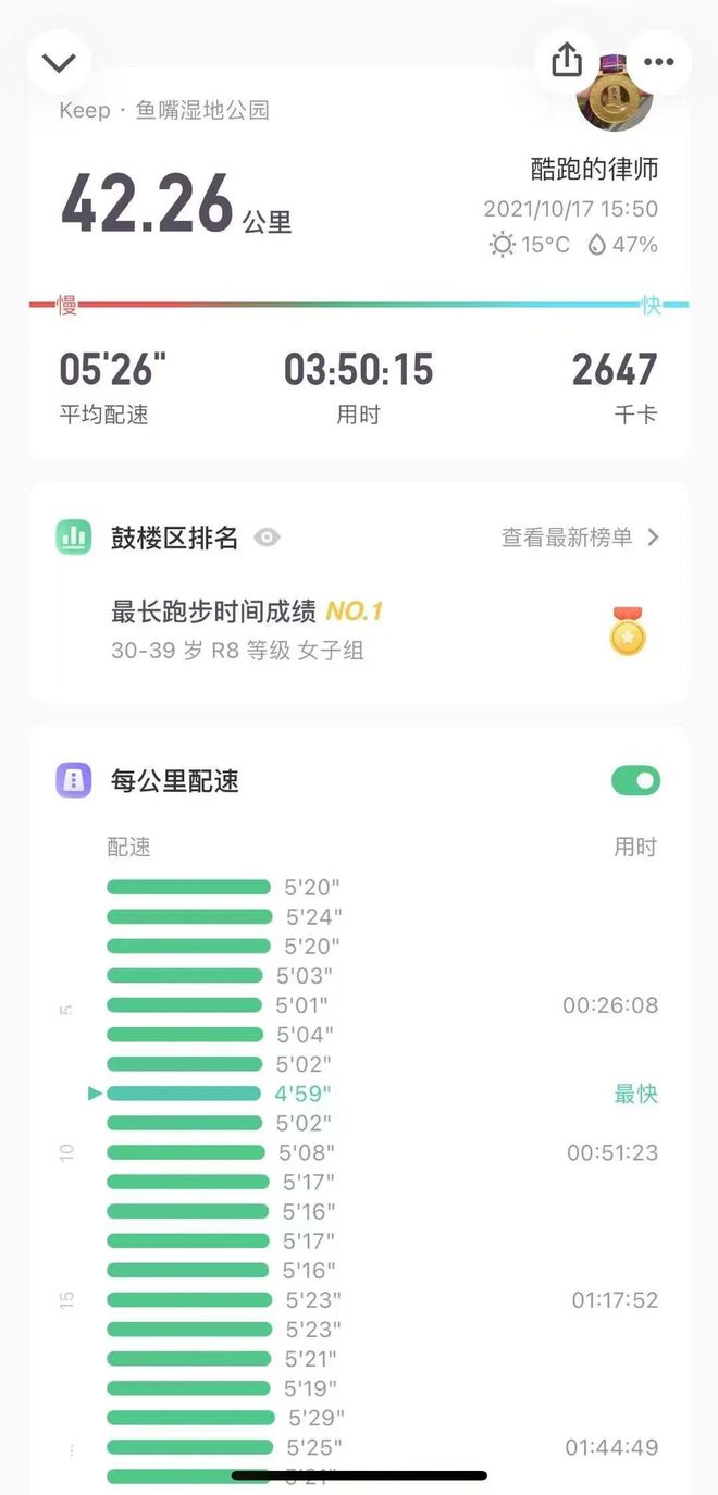 她像分析案件一样“审视”自己——睡眠如何、静息心率如何、压力指数以及训练时身体的感受。如果时间有限,她会调换间歇课和有氧课的顺序,优先完成耗时少的计划;如果睡眠不足,那么原定的15公里有氧跑可能会缩短为8公里的恢复跑;如果连续数日高强度工作,周末的长距离拉练便不会硬扛,要么休息,要么将长距离拆解为几个部分,分段完成;赛前,她也会提前分析比赛日天气,如果预报气温较高,她会主动降低配速目标,将完赛策略从“追求成绩”调整为“稳中求进”。