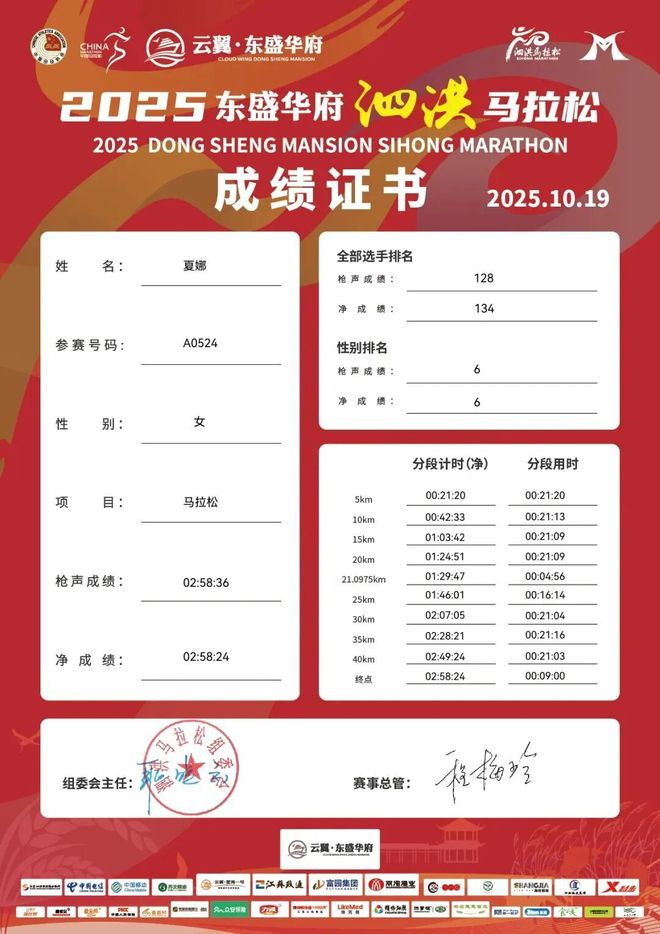 两年后,她在泗洪马拉松上成功破三,以2:58:24完赛。