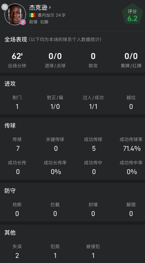 雷速体育9月20日宣 德甲第4轮比赛,拜仁客场4-1轻取霍芬海姆。此役新援杰克逊迎来首次首发机会,但出战62分钟的他表现平平,仍未打开他在拜仁的进球账户。杰克逊本场主要个人数