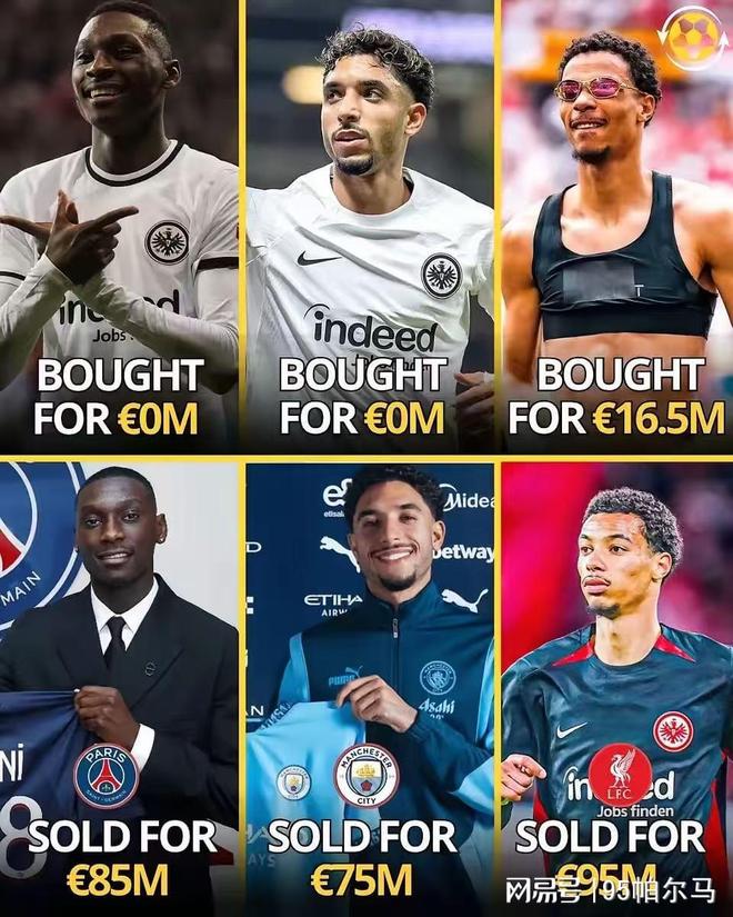 法兰克福属于新势力的“黑店”。2019年约维奇以6300万欧元转会皇马,阿莱以5000万欧元转会西汉姆,2023年穆阿尼以8500万欧加盟巴黎,2025年马尔穆什以7500万欧元加盟曼城,埃基蒂克
