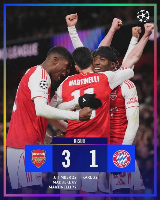 酋长球场的欧冠之夜:从1-1到3-1的战术博弈当伦敦的夜色笼罩酋长球场,记分牌上跳动的数字最终定格在3-1——这是阿森纳在欧冠联赛阶段第5轮送给拜仁慕尼黑的比分。22分钟廷伯的
