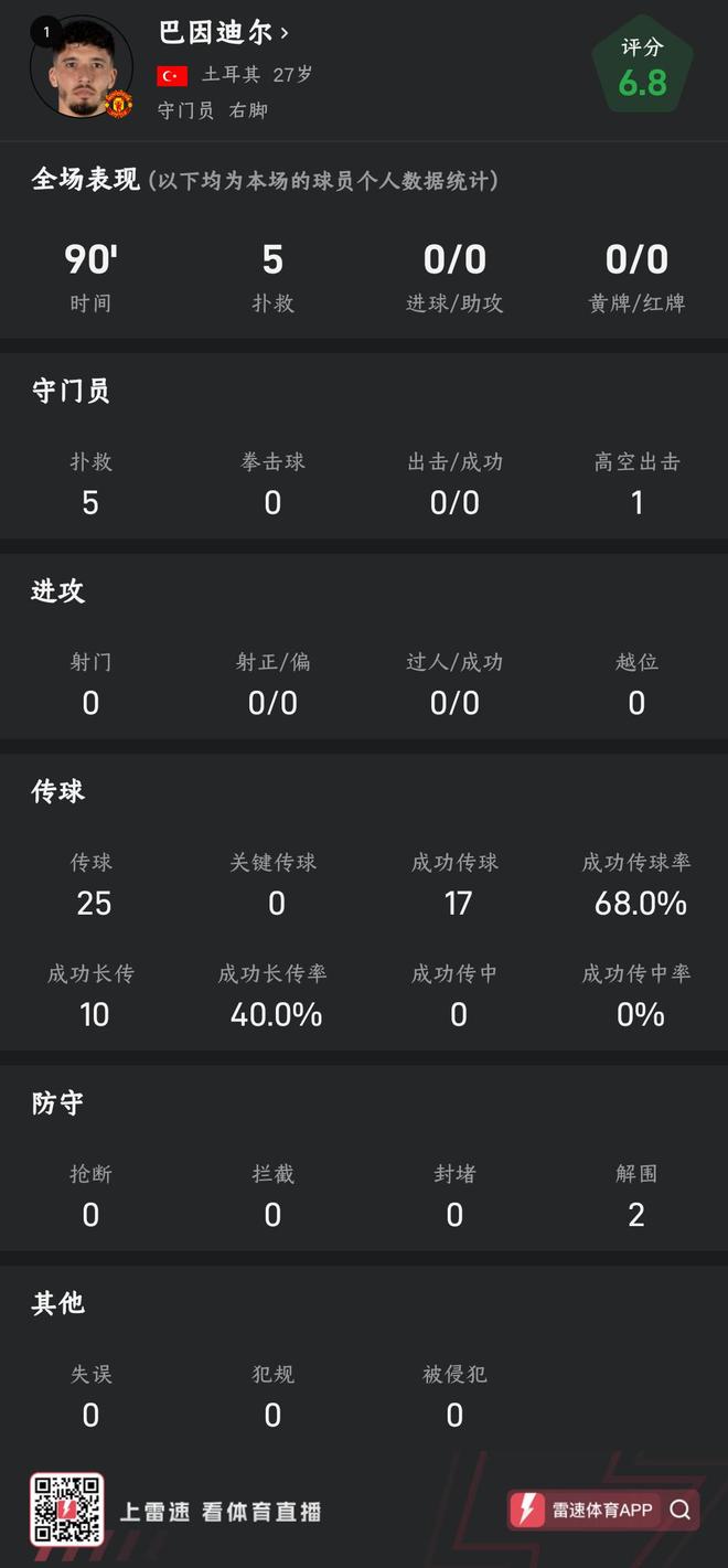 雷速体育9月27日宣 英超联赛第6轮,曼联虽客场1-3不敌布伦特福德,但曼联门将巴因迪尔在此役的发挥仍旧是可圈可点。如若不是巴因迪尔多次神扑救险,曼联恐早早崩盘。该场比赛中,