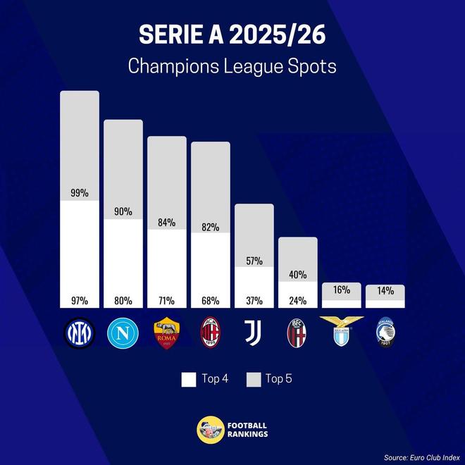 北京时间11月11日,Football Rankings预测了本赛季意甲强队最终进入联赛前四名并获得欧冠资格的概率,其中国际米兰以97%高居第一,AC米兰68%,尤文图斯仅37%。