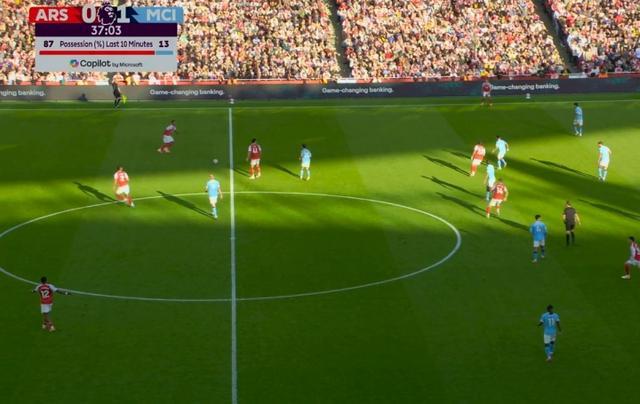 直播吧09月22日宣 阿森纳vs曼城第37分钟,转播给出最近10分钟的控球率,阿森纳控球87%!但是局面打不开!独家看英超就在咪咕