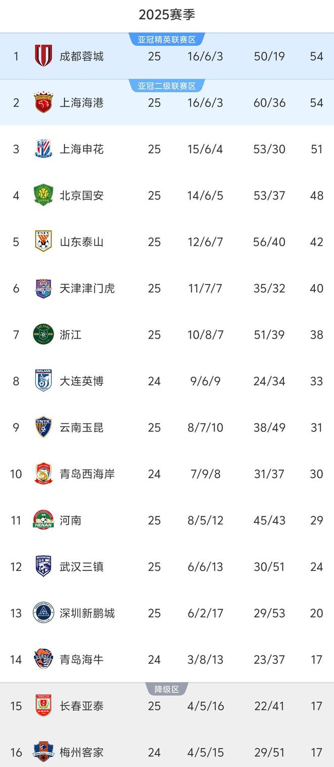 最新积分榜方面,前3球队最大分差为3分。成都蓉城与上海海港同积54分,成都蓉城凭借着相互战绩的优势保住榜首位置,上港仍列次席,积51分的申花排在第3,与榜首差3分。3连败的国安积48分仍排在第4,与榜首的分差已经扩大到6分,这意味着他们退出了争冠行列。